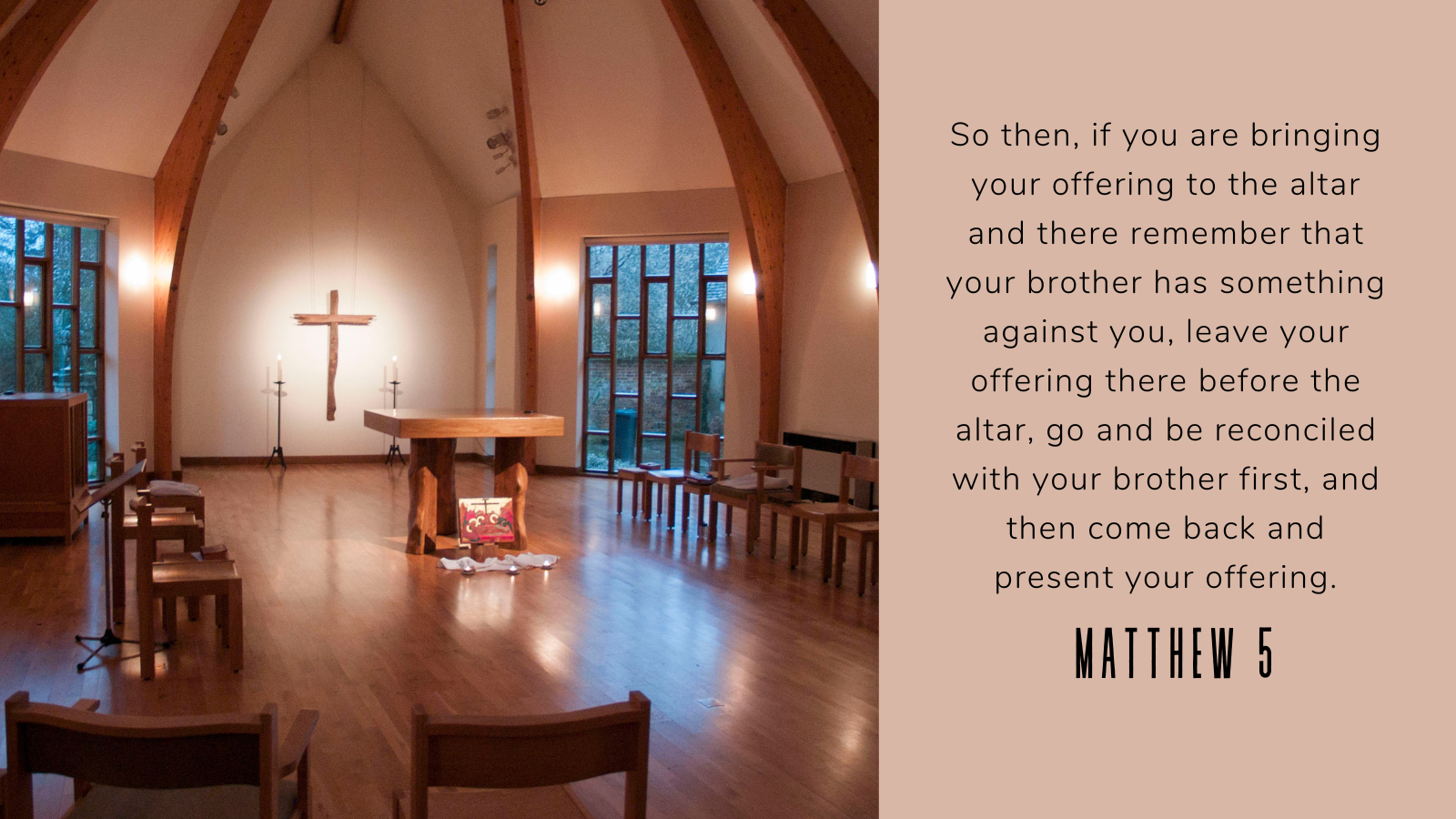 Liturgy and life are intimately connected. What happens in our sacred spaces in symbol and ritual gives us a pattern for our daily lives. In our worship and our daily lives we are called to be upright before God, true to ourselves and reconciled with our neighbour. It’s all of a piece.