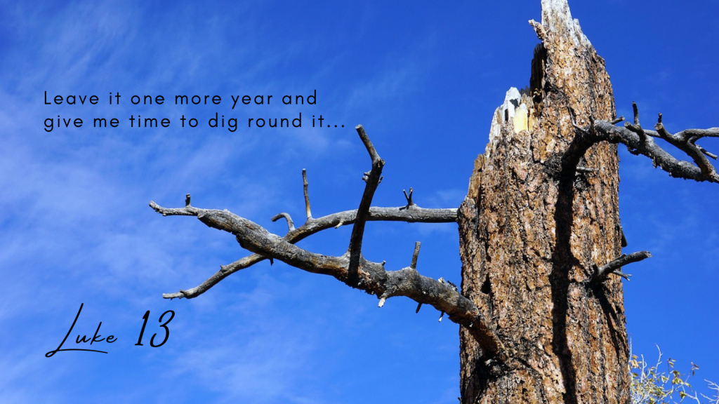 A man had a fig tree planted in his vineyard, and he came looking for fruit on it but found none. He said to the man who looked after the vineyard, ‘Look here, for three years now I have been coming to look for fruit on this fig tree and finding none. Cut it down: why should it be taking up the ground?’ ‘Sir,’ the man replied ‘leave it one more year and give me time to dig round it and manure it: it may bear fruit next year; if not, then you can cut it down.’