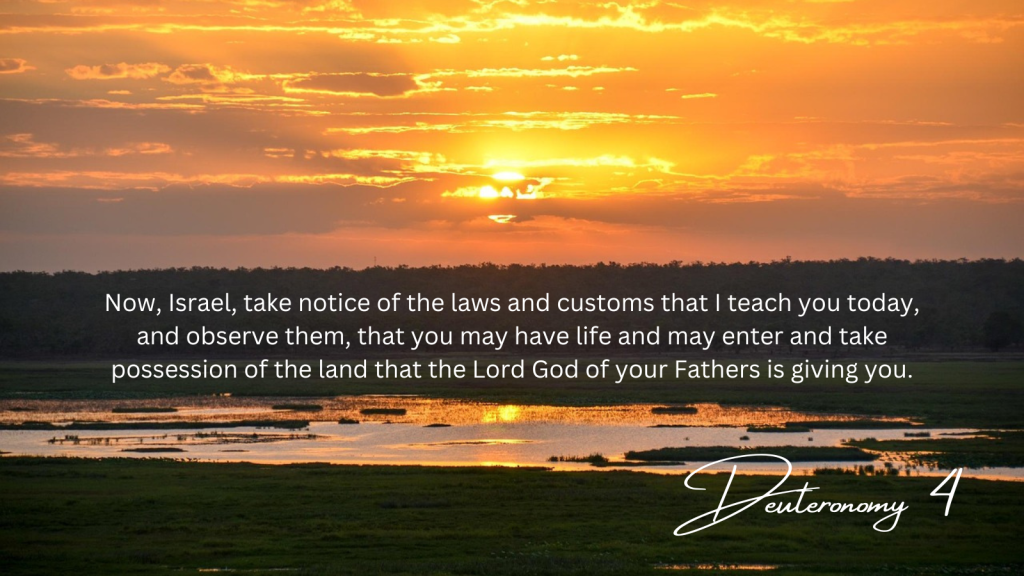 Moses said to the people; Now, Israel, take notice of the laws and customs that I teach you today, and observe them, that you may have life and may enter and take possession of the land that the Lord God of your Fathers is giving you.