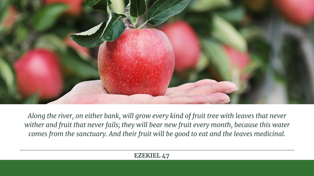 Along the river, on either bank, will grow every kind of fruit tree with leaves that never wither and fruit that never fails; they will bear new fruit every month, because this water comes from the sanctuary. And their fruit will be good to eat and the leaves medicinal.