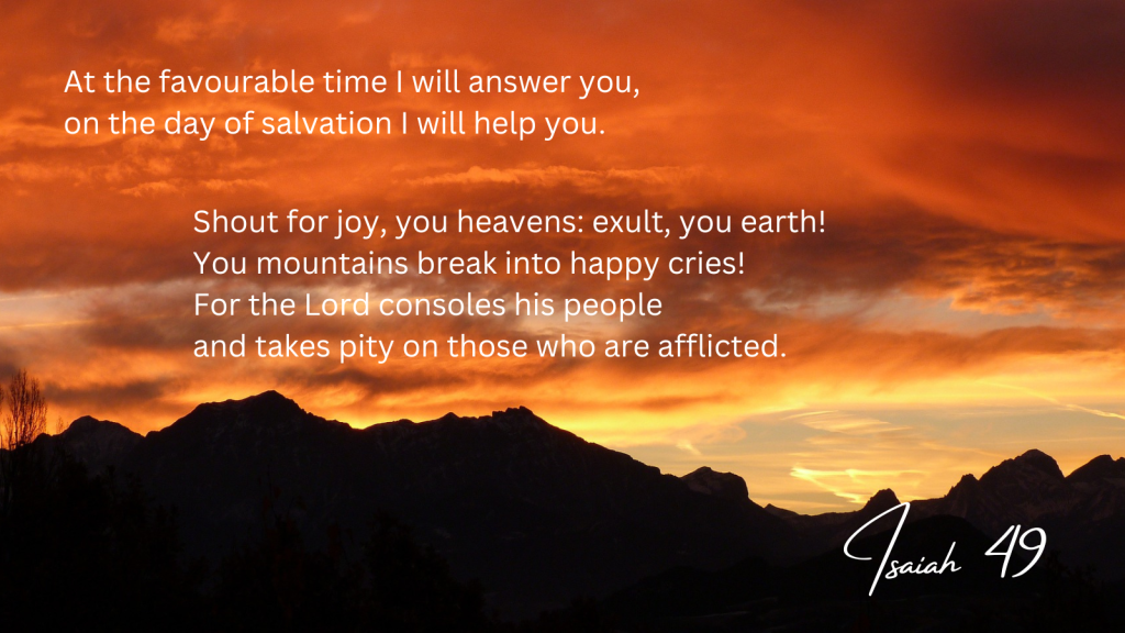 Each year in Lent the Church gives us the opportunity to revisit the story of our salvation. It’s a story of faith and great ideals, of times of bitter disappointment and the utmost courage. In the first readings in our weekday lectionary we are invited to identify with the people of Israel. God chooses a people to be the bearers of hope and light. God chooses a people to a beacon of faithful love. Their initial hope and courage is tested to its limits when they find themselves in Exile. Just when they feel that every last glimmer of hope is lost Isaiah paints a vision of a joyful return to Jerusalem. After years of soul wearying waiting God declares that now is the ‘day of salvation.’ Into the depths of their despair and fear of abandonment, God speaks words of hope: