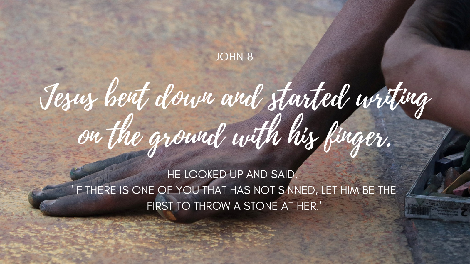 This is perhaps one of the most tender encounters in all of the Gospels. We picture the uncomfortable scene of a woman brought by the Pharisees to Jesus. In the eyes of the crowd she is in disgrace. But Jesus diffuses a situation, shifting the focus away from the woman and writing in the dust. With this simple action he makes space for the woman. He makes a frightening situation safe for her. We will never know what he wrote. And this, for me, makes the encounter all the more tender.