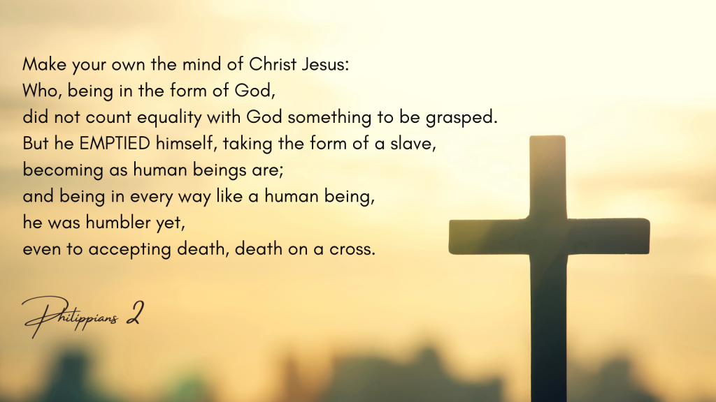 This ancient hymn in the Letter to the Philippians is a touchstone text of our faith. The hymn is framed by the invitation to me to make my own the mind of Christ. Whichever way I approach this text it’s the word ’emptied’ which always stands out for me. Christ here, freely and lovingly, empties himself of everything except the doing of his Father’s will.